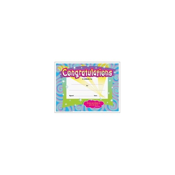 Award certificates feature an inspiring quotation and contemporary artwork to mark achievement throughout the year. Take every opportunity to honor older students as well as adult volunteers and staff. You can easily customize them for any occasion. Each ready-to-frame certificate offers congratulations with the Walt Disney quote, "If you can dream it, you can do it." Ready-to-frame certificates are compatible with laser and inkjet printers and ideal for students in third-grade to eighth-grade (ages 8 to 14).