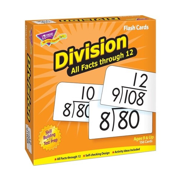 Content-rich math cards do their job, teaching students new skills in a fun way. This educational aid helps students build division skills. Equations are presented two ways to reinforce skills. Complete tables feature all numbers from 0 to 12. Answers on the back allow self-checking. Students will delight in mastering new skills. No-see-through cards have quick-sorting, rounded corners. Sturdy flash cards come in a storage box and are ideal for teaching ages 9 and up.