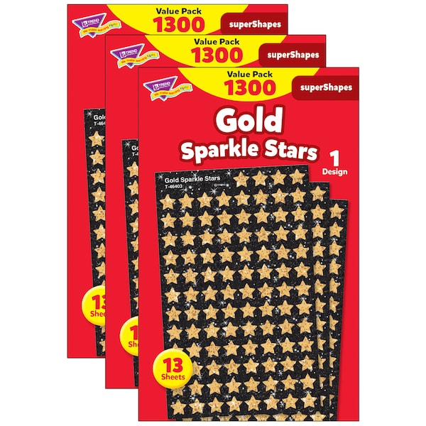 Themed superShapes Stickers are fast favorites at a great value, and these classic gold sparkle stars are always welcome to see! Fun for student rewards and on homework folders. Just the right size for Incentive Charts and Incentive Pads. Acid free, nontoxic, and safe for photos. Each pack includes 1300 stickers. Sold as 3 packs for a total of 3900 stickers.