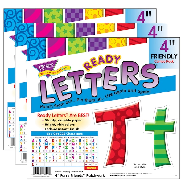 Lively letters, limitless possibilities! Convenient, reusable, and easy to use. Great for student work displays, bulletin boards, signs, banners, news boards, learning activities, labeling, and much more! Fade-resistant colors coordinate with TREND products. Durable. Each pack includes 50 uppercase letters, 82 lowercase letters, 21 numerals 0-9, 44 punctuation marks, and 28 Spanish accent marks in assorted colors and patterns. Sold as 3 packs. Coordinates with Furry Friends Collection.