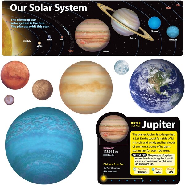 Strengthen students' knowledge of the Earth's fellow planets and the solar system we share. The new way to teach about Pluto and dwarf planets is featured. Includes 9 planets, Earth's Moon, 9 planet cards, 1 Sun card, and 1 title piece with orbit order. 21 pieces, up to 36". Includes a Discovery Guide with creative activities that teach and delight!