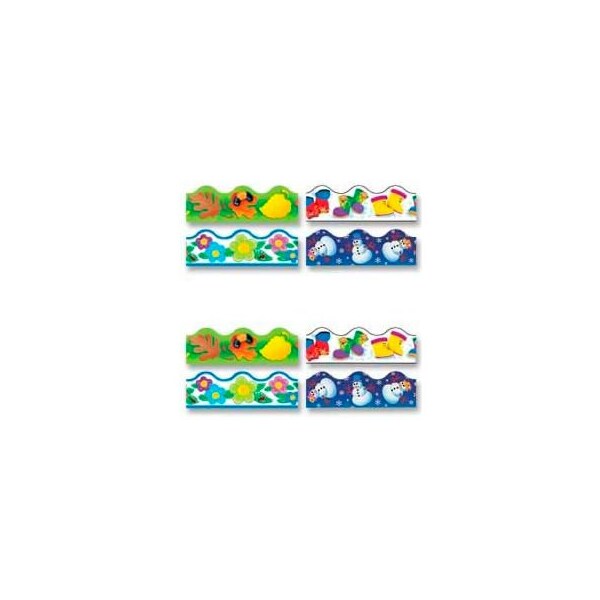 Trend four seasons terrific trimmers variety pack, 156' long, 1 pack keep these favorite trimmers handy for changing displays anytime. 2-1/4" x 39' each of fall fun, rainy day boots, crayon flowers, and winter fun. 156 feet total. Ideal for prekindergarten to ninth-grade (ages 3 to 15).