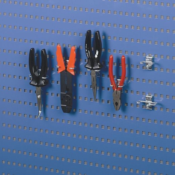 Pliers/Wrench Tool Holder, Number of Hooks 5, Overall Height 2 in, Overall Length 1/2 in, Overall Width 1 31/32 in, 1 in For Pegboard Hole Spacing, For Pegboard Hole Size 3/8 in, For Tool Type Pliers, Wrenches, Surface, Screw-In Locking System, Square For Pegboard Hole Shape, Steel, Silver, Zinc-Plated, Toolholder Accessory Type, Black Holding Clip, Bolts, Package Quantity 5