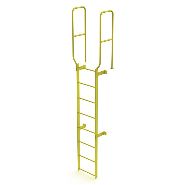 Fixed Ladder, Walk-Thru Included Yes, Exit Top, Overall Height 11 ft, Overall Width 28 in, Material Steel, Load Capacity 450 lb, Number of Steps 8, Top Step Height 7 ft, Rung Dia. 3/4 in, Rung/Step Spacing 12 in, Step Width 18 in, Finish Safety Yellow, Standards ANSI; OSHA Compliant, Includes 42 In. guardrails, Manufacturers Warranty Length 1 yr