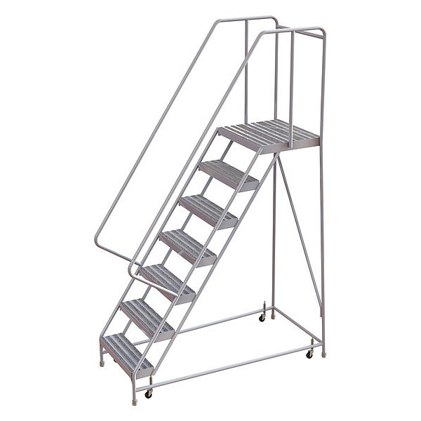 Rolling Ladder, Material Aluminum, Platform Height 5.8 ft, Handrails Included Yes, Handrail Height 2.7 ft, Overall Height 8.5 ft, Number of Steps 7, Assembled, Load Capacity 350 lb, Step Tread Ribbed, Platform Depth 21 in, Platform Width 24 in, Bottom Width 32 in, Base Depth 64 in, Overall Width 32 in, Climbing Angle 56 Degrees , Step Depth 7 in, Step Width 24 in, Ladder Actuation Spring-Loaded Casters, Finish Powder Coated, Color Gray, Standards ANSI, OSHA Compliant, Includes Crutch Tips