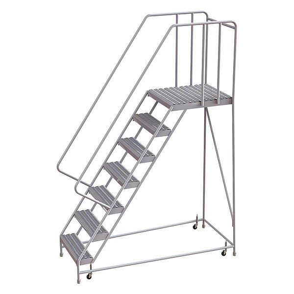 Rolling Ladder, Material Aluminum, Platform Height 5.8 ft, Handrails Included Yes, Handrail Height 2.7 ft, Overall Height 8.5 ft, Number of Steps 7, Assembled, Load Capacity 350 lb, Step Tread Serrated, Platform Depth 28 in, Platform Width 24 in, Bottom Width 32 in, Base Depth 71 in, Overall Width 32 in, Climbing Angle 56 Degrees , Step Depth 7 in, Step Width 24 in, Ladder Actuation Spring-Loaded Casters, Finish Powder Coated, Color Gray, Standards ANSI, OSHA Compliant, Includes Crutch Tips