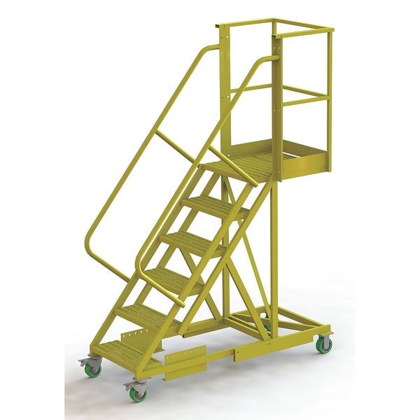 Material Steel, Platform Height 5 ft, Handrails Included Yes, Handrail Height 3.5 ft, Overall Height 8.5 ft, Number of Steps 6, Unassembled, Load Capacity 300 lb, Step Tread Serrated, Platform Depth 20 in, Platform Width 24 in, Bottom Width 41 in, Base Depth 72 in, Climbing Angle 50 Degrees , Step Depth 10 in, Step Width 24 in, Ladder Actuation Locking Casters, Finish Powder Coated, Color Yellow, Standards ANSI, OSHA Compliant, Manufacturers Warranty Length 1 yr