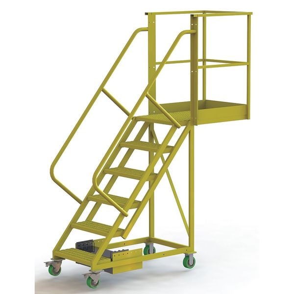 Material Steel, Platform Height 5 ft, Handrails Included Yes, Handrail Height 3.5 ft, Overall Height 8.5 ft, Number of Steps 6, Unassembled, Load Capacity 300 lb, Step Tread Serrated, Platform Depth 30 in, Platform Width 24 in, Bottom Width 30 in, Base Depth 82 in, Climbing Angle 50 Degrees , Step Depth 10 in, Step Width 24 in, Ladder Actuation Locking Casters, Finish Powder Coated, Color Yellow, Standards ANSI, OSHA Compliant, Manufacturers Warranty Length 1 yr