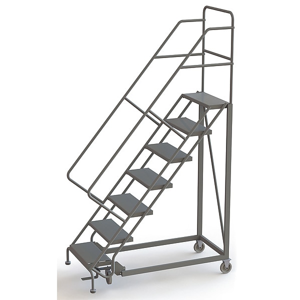 Configurable Rolling Ladder, Material Steel, Platform Height 5.8 ft, Handrails Included Yes, Handrail Height 3 ft, Overall Height 9.3 ft, Number of Steps 7, Unassembled, Load Capacity 450 lb, Step Tread Perforated, Platform Depth 17 in, Platform Width 24 in, Bottom Width 35 in, Base Depth 74 in, Overall Width 35 in, Climbing Angle 50 Degrees , Step Depth 8.5 in, Step Width 24 in, Ladder Actuation Foot Activated Step Lock, Finish Powder Coated, Color Gray, Standards ANSI, OSHA Compliant