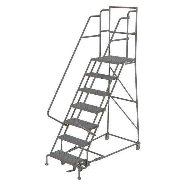 Rolling Ladder, Material Steel, Platform Height 5.8 ft, Handrails Included Yes, Handrail Height 3 ft, Overall Height 9.3 ft, Number of Steps 7, Unassembled, Load Capacity 450 lb, Step Tread Perforated, Platform Depth 20 in, Platform Width 16 in, Bottom Width 27 in, Base Depth 67 in, Overall Width 27 in, Climbing Angle 56 Degrees , Step Depth 7 in, Step Width 16 in, Ladder Actuation Foot Activated Step Lock, Finish Powder Coated, Color Gray, Standards ANSI, OSHA Compliant