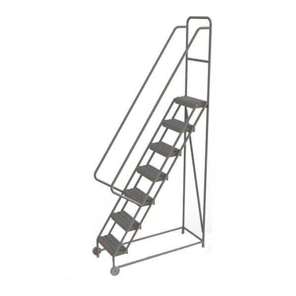 Tilt and Roll Ladder, Material Steel, Platform Height 5.8 ft, Handrails Included Yes, Handrail Height 3 ft, Overall Height 9.3 ft, Number of Steps 7, Unassembled, Load Capacity 450 lb, Step Tread Serrated, Platform Depth 10 in, Platform Width 16 in, Bottom Width 31 in, Base Depth 59 in, Overall Width 31 in, Climbing Angle 56 Degrees , Step Depth 7 in, Step Width 16 in, Ladder Actuation None, Finish Powder Coated, Color Gray, Standards ANSI, OSHA Compliant, Includes Crutch Tips