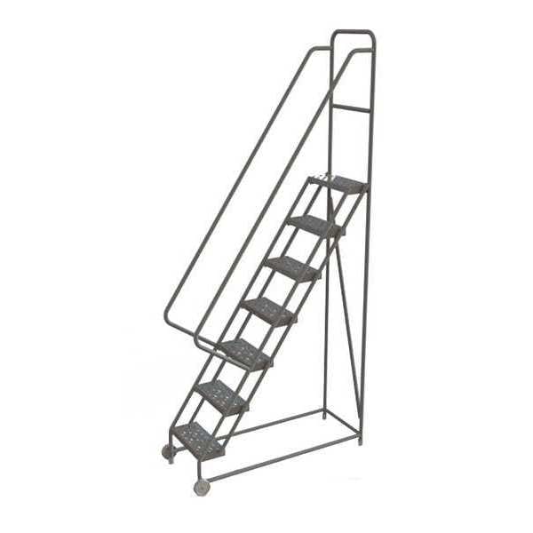 Tilt and Roll Ladder, Material Steel, Platform Height 5.8 ft, Handrails Included Yes, Handrail Height 3 ft, Overall Height 9.3 ft, Number of Steps 7, Unassembled, Load Capacity 450 lb, Step Tread Perforated, Platform Depth 10 in, Platform Width 16 in, Bottom Width 31 in, Base Depth 59 in, Overall Width 31 in, Climbing Angle 56 Degrees , Step Depth 7 in, Step Width 16 in, Ladder Actuation None, Finish Powder Coated, Color Gray, Standards ANSI, OSHA Compliant, Includes Crutch Tips