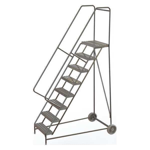Wheelbarrow Ladder, Material Aluminum, Platform Height 6.7 ft, Handrails Included Yes, Handrail Height 2.7 ft, Overall Height 9.3 ft, Number of Steps 8, Assembled, Load Capacity 350 lb, Step Tread Ribbed, Platform Depth 14 in, Platform Width 24 in, Bottom Width 37 in, Base Depth 70 1/2 in, Overall Width 37 in, Climbing Angle 56 Degrees , Step Depth 7 in, Step Width 24 in, Ladder Actuation None, Finish Unfinished, Color Gray, Standards ANSI, OSHA Compliant, Includes Crutch Tips