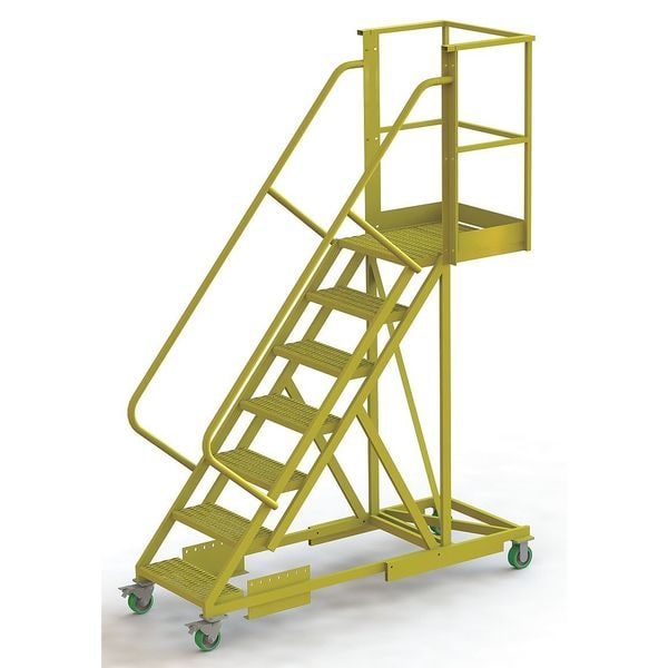 Material Steel, Platform Height 5.8 ft, Handrails Included Yes, Handrail Height 3.5 ft, Overall Height 9.3 ft, Number of Steps 7, Unassembled, Load Capacity 300 lb, Step Tread Serrated, Platform Depth 20 in, Platform Width 24 in, Bottom Width 41 in, Base Depth 81 in, Climbing Angle 50 Degrees , Step Depth 10 in, Step Width 24 in, Ladder Actuation Locking Casters, Finish Powder Coated, Color Yellow, Standards ANSI, OSHA Compliant, Manufacturers Warranty Length 1 yr