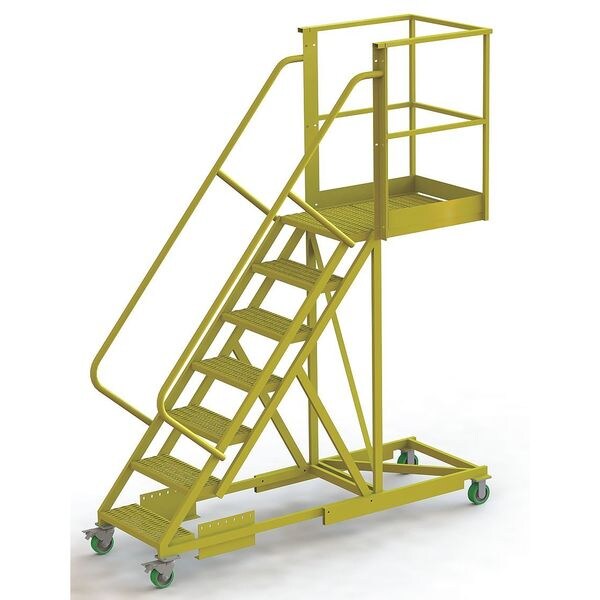 Material Steel, Platform Height 5.8 ft, Handrails Included Yes, Handrail Height 3.5 ft, Overall Height 9.3 ft, Number of Steps 7, Unassembled, Load Capacity 300 lb, Step Tread Serrated, Platform Depth 30 in, Platform Width 24 in, Bottom Width 41 in, Base Depth 91 in, Climbing Angle 50 Degrees , Step Depth 10 in, Step Width 24 in, Ladder Actuation Locking Casters, Finish Powder Coated, Color Yellow, Standards ANSI, OSHA Compliant, Manufacturers Warranty Length 1 yr