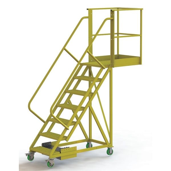 Material Steel, Platform Height 5.8 ft, Handrails Included Yes, Handrail Height 3.5 ft, Overall Height 9.3 ft, Number of Steps 7, Unassembled, Load Capacity 300 lb, Step Tread Serrated, Platform Depth 30 in, Platform Width 24 in, Bottom Width 30 in, Base Depth 91 in, Climbing Angle 50 Degrees , Step Depth 10 in, Step Width 24 in, Ladder Actuation Locking Casters, Finish Powder Coated, Color Yellow, Standards ANSI, OSHA Compliant, Manufacturers Warranty Length 1 yr