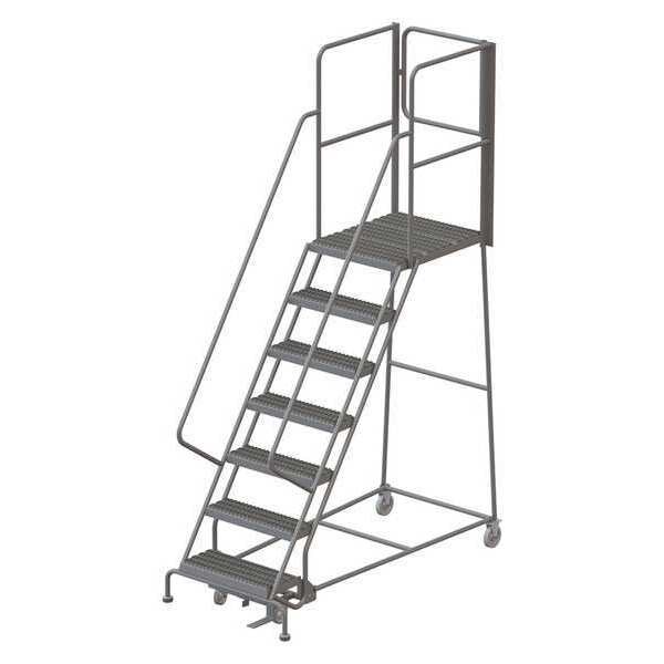 Rolling Ladder, Material Steel, Platform Height 5.8 ft, Handrails Included Yes, Handrail Height 3.5 ft, Overall Height 9.3 ft, Number of Steps 7, Unassembled, Load Capacity 450 lb, Step Tread Serrated, Platform Depth 10 in, Platform Width 24 in, Bottom Width 35 in, Base Depth 77 in, Overall Width 35 in, Climbing Angle 56 Degrees , Step Depth 7 in, Step Width 24 in, Ladder Actuation Foot Activated Step Lock, Finish Powder Coated, Color Gray, Standards ANSI, OSHA Compliant, Includes Rear-Exit Gate