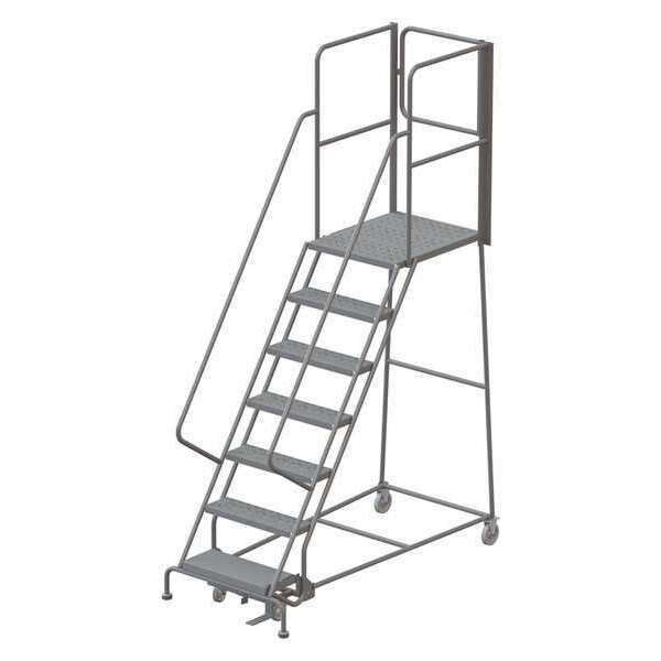 Rolling Ladder, Material Steel, Platform Height 5.8 ft, Handrails Included Yes, Handrail Height 3.5 ft, Overall Height 9.3 ft, Number of Steps 7, Unassembled, Load Capacity 450 lb, Step Tread Perforated, Platform Depth 10 in, Platform Width 24 in, Bottom Width 35 in, Base Depth 77 in, Overall Width 35 in, Climbing Angle 56 Degrees , Step Depth 7 in, Step Width 24 in, Ladder Actuation Foot Activated Step Lock, Finish Powder Coated, Color Gray, Standards ANSI, OSHA Compliant
