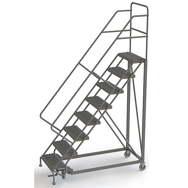 Configurable Rolling Ladder, Material Steel, Platform Height 6.7 ft, Handrails Included Yes, Handrail Height 3 ft, Overall Height 10.2 ft, Number of Steps 8, Unassembled, Load Capacity 450 lb, Step Tread Serrated, Platform Depth 17 in, Platform Width 24 in, Bottom Width 35 in, Base Depth 82 in, Overall Width 35 in, Climbing Angle 50 Degrees , Step Depth 8.5 in, Step Width 24 in, Ladder Actuation Foot Activated Step Lock, Finish Powder Coated, Color Gray, Standards ANSI, OSHA Compliant