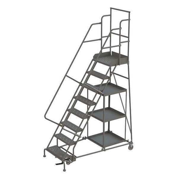 Stock Picking Rolling Ladder, Material Steel, Platform Height 6.7 ft, Handrails Included Yes, Handrail Height 3 ft, Overall Height 10.2 ft, Number of Steps 8, Unassembled, Load Capacity 450 lb, Step Tread Serrated, Platform Depth 20 in, Platform Width 24 in, Bottom Width 35 in, Base Depth 73 in, Overall Width 35 in, Climbing Angle 56 Degrees , Step Depth 7 in, Step Width 24 in, Ladder Actuation Foot Activated Step Lock, Finish Powder Coated, Color Gray, Standards ANSI, OSHA Compliant
