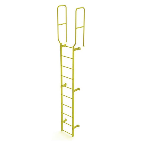 Fixed Ladder, Walk-Thru Included Yes, Exit Top, Overall Height 13 ft, Overall Width 28 in, Material Steel, Load Capacity 450 lb, Number of Steps 10, Top Step Height 9 ft, Rung Dia. 3/4 in, Rung/Step Spacing 12 in, Step Width 18 in, Finish Safety Yellow, Standards ANSI; OSHA Compliant, Includes 42 In. guardrails, Manufacturers Warranty Length 1 yr