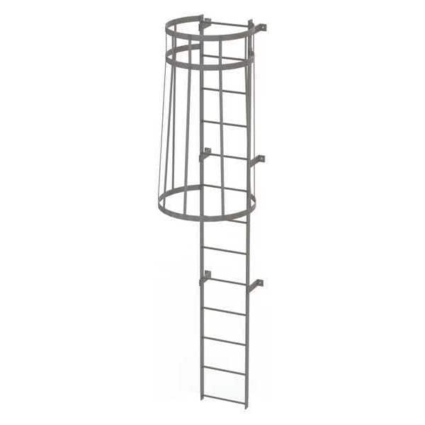 Fixed Ladder with Safety Cage, Walk-Thru Included No, Exit Top, Overall Height 12 ft, Overall Width 18 in, Material Steel, Load Capacity 500 lb, Number of Steps 13, Top Step Height 12 ft, Rung Dia. 3/4 in, Rung/Step Spacing 12 in, Step Width 18 in, Finish Powder Coated, Standards ANSI, OSHA Compliant, Manufacturers Warranty Length 1 yr, Handrail Height Not Applicable