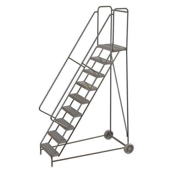 Wheelbarrow Ladder, Material Aluminum, Platform Height 7.5 ft, Handrails Included Yes, Handrail Height 2.7 ft, Overall Height 10.2 ft, Number of Steps 9, Assembled, Load Capacity 350 lb, Step Tread Ribbed, Platform Depth 14 in, Platform Width 24 in, Bottom Width 37 in, Base Depth 76 1/2 in, Overall Width 37 in, Climbing Angle 56 Degrees , Step Depth 7 in, Step Width 24 in, Ladder Actuation None, Finish Unfinished, Color Gray, Standards ANSI, OSHA Compliant, Includes Crutch Tips