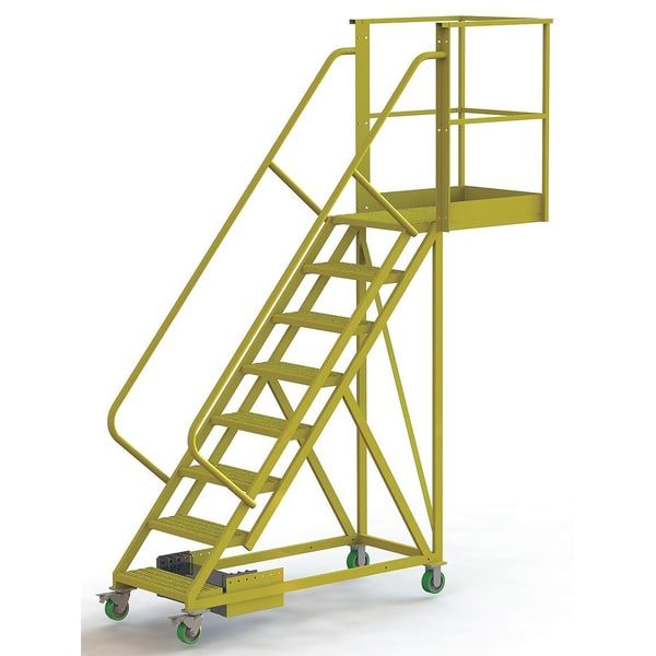 Material Steel, Platform Height 6.7 ft, Handrails Included Yes, Handrail Height 3.5 ft, Overall Height 10.2 ft, Number of Steps 8, Unassembled, Load Capacity 300 lb, Step Tread Serrated, Platform Depth 30 in, Platform Width 24 in, Bottom Width 30 in, Base Depth 99 in, Climbing Angle 50 Degrees , Step Depth 10 in, Step Width 24 in, Ladder Actuation Locking Casters, Finish Powder Coated, Color Yellow, Standards ANSI, OSHA Compliant, Manufacturers Warranty Length 1 yr