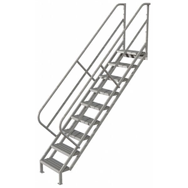 Stair Unit, Material Steel, Number of Steps 9, Handrails Included Yes, Load Capacity 450 lb, Climbing Angle 45 Degrees , Step Tread Serrated, Step Width 24 in, Step Depth 10 in, Base Depth 86 1/2 in, Overall Height 10.3 ft, Color Gray, Standards ANSI, OSHA Compliant, Manufacturers Warranty Length 1 yr, Overall Width 29 in