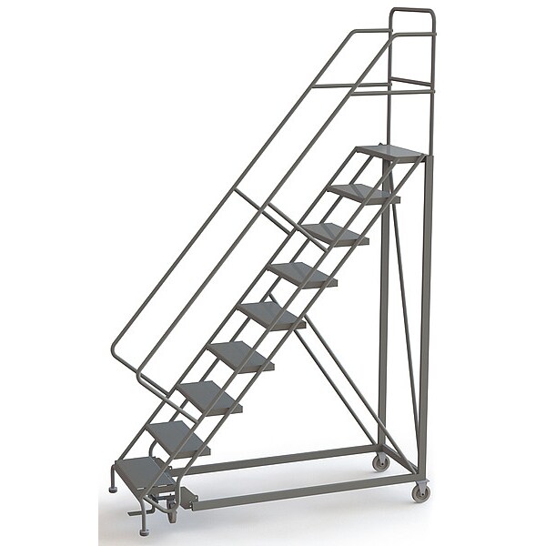 Configurable Rolling Ladder, Material Steel, Platform Height 7.5 ft, Handrails Included Yes, Handrail Height 3 ft, Overall Height 11 ft, Number of Steps 9, Unassembled, Load Capacity 450 lb, Step Tread Perforated, Platform Depth 17 in, Platform Width 24 in, Bottom Width 35 in, Base Depth 91 in, Overall Width 35 in, Climbing Angle 50 Degrees , Step Depth 8.5 in, Step Width 24 in, Ladder Actuation Foot Activated Step Lock, Finish Powder Coated, Color Gray, Standards ANSI, OSHA Compliant