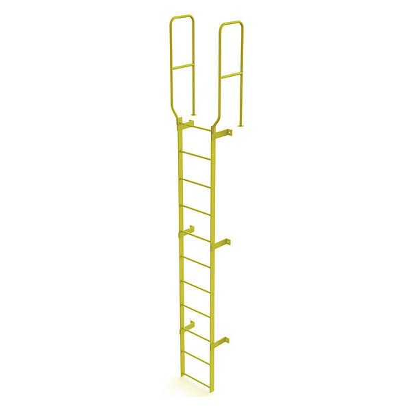 Fixed Ladder, Walk-Thru Included Yes, Exit Top, Overall Height 14 ft, Overall Width 28 in, Material Steel, Load Capacity 450 lb, Number of Steps 11, Top Step Height 10 ft, Rung Dia. 3/4 in, Rung/Step Spacing 12 in, Step Width 18 in, Finish Safety Yellow, Standards ANSI; OSHA Compliant, Includes 42 In. guardrails, Manufacturers Warranty Length 1 yr