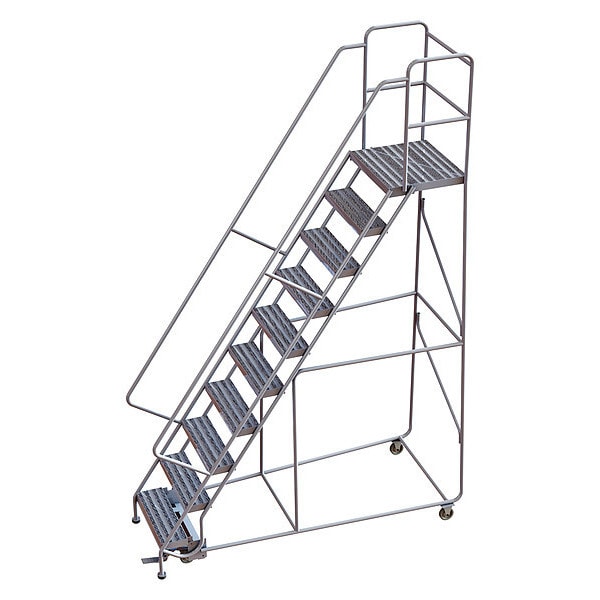 Rolling Ladder, Material Aluminum, Platform Height 8.3 ft, Handrails Included Yes, Handrail Height 2.7 ft, Overall Height 11 ft, Number of Steps 10, Assembled, Load Capacity 350 lb, Step Tread Ribbed, Platform Depth 21 in, Platform Width 24 in, Bottom Width 36 in, Base Depth 86 in, Overall Width 36 in, Climbing Angle 56 Degrees , Step Depth 7 in, Step Width 24 in, Ladder Actuation Foot Activated Step Lock, Finish Powder Coated, Color Gray, Standards ANSI, OSHA Compliant