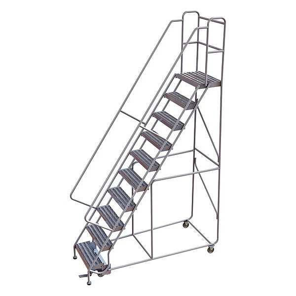 Rolling Ladder, Material Aluminum, Platform Height 8.3 ft, Handrails Included Yes, Handrail Height 2.7 ft, Overall Height 11 ft, Number of Steps 10, Assembled, Load Capacity 350 lb, Step Tread Ribbed, Platform Depth 28 in, Platform Width 24 in, Bottom Width 36 in, Base Depth 93 in, Overall Width 36 in, Climbing Angle 56 Degrees , Step Depth 7 in, Step Width 24 in, Ladder Actuation Foot Activated Step Lock, Finish Powder Coated, Color Gray, Standards ANSI, OSHA Compliant