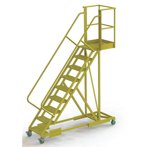Material Steel, Platform Height 7.5 ft, Handrails Included Yes, Handrail Height 3.5 ft, Overall Height 11 ft, Number of Steps 9, Unassembled, Load Capacity 300 lb, Step Tread Perforated, Platform Depth 20 in, Platform Width 24 in, Bottom Width 41 in, Base Depth 97 in, Climbing Angle 50 Degrees , Step Depth 8.5 in, Step Width 24 in, Ladder Actuation Locking Casters, Finish Powder Coated, Color Yellow, Standards ANSI, OSHA Compliant, Manufacturers Warranty Length 1 yr