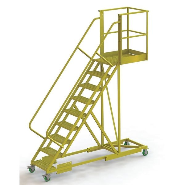 Material Steel, Platform Height 7.5 ft, Handrails Included Yes, Handrail Height 3.5 ft, Overall Height 11 ft, Number of Steps 9, Unassembled, Load Capacity 300 lb, Step Tread Perforated, Platform Depth 30 in, Platform Width 24 in, Bottom Width 41 in, Base Depth 107 in, Climbing Angle 50 Degrees , Step Depth 8.5 in, Step Width 24 in, Ladder Actuation Locking Casters, Finish Powder Coated, Color Yellow, Standards ANSI, OSHA Compliant, Manufacturers Warranty Length 1 yr