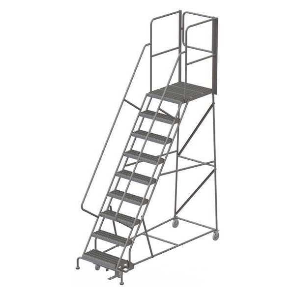 Rolling Ladder, Material Steel, Platform Height 7.5 ft, Handrails Included Yes, Handrail Height 3.5 ft, Overall Height 11 ft, Number of Steps 9, Unassembled, Load Capacity 450 lb, Step Tread Serrated, Platform Depth 10 in, Platform Width 24 in, Bottom Width 35 in, Base Depth 89 in, Overall Width 35 in, Climbing Angle 56 Degrees , Step Depth 7 in, Step Width 24 in, Ladder Actuation Foot Activated Step Lock, Finish Powder Coated, Color Gray, Standards ANSI, OSHA Compliant, Includes Rear-Exit Gate