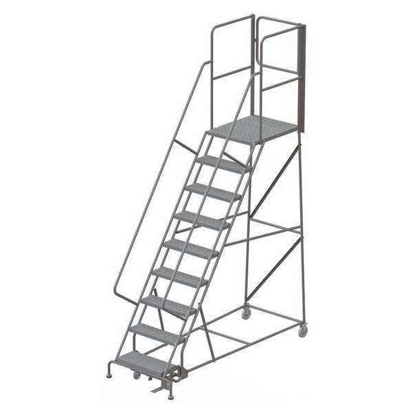 Rolling Ladder, Material Steel, Platform Height 7.5 ft, Handrails Included Yes, Handrail Height 3.5 ft, Overall Height 11 ft, Number of Steps 9, Unassembled, Load Capacity 450 lb, Step Tread Perforated, Platform Depth 10 in, Platform Width 24 in, Bottom Width 35 in, Base Depth 89 in, Overall Width 35 in, Climbing Angle 56 Degrees , Step Depth 7 in, Step Width 24 in, Ladder Actuation Foot Activated Step Lock, Finish Powder Coated, Color Gray, Standards ANSI, OSHA Compliant
