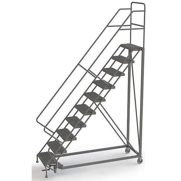 Configurable Rolling Ladder, Material Steel, Platform Height 8.3 ft, Handrails Included Yes, Handrail Height 3 ft, Overall Height 11.8 ft, Number of Steps 10, Unassembled, Load Capacity 450 lb, Step Tread Serrated, Platform Depth 17 in, Platform Width 24 in, Bottom Width 35 in, Base Depth 99 in, Overall Width 35 in, Climbing Angle 50 Degrees , Step Depth 8.5 in, Step Width 24 in, Ladder Actuation Foot Activated Step Lock, Finish Powder Coated, Color Gray, Standards ANSI, OSHA Compliant