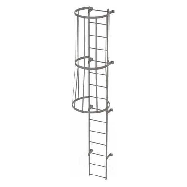 Fixed Ladder with Safety Cage, Walk-Thru Included No, Exit Top, Overall Height 14 ft, Overall Width 18 in, Material Steel, Load Capacity 500 lb, Number of Steps 15, Top Step Height 14 ft, Rung Dia. 3/4 in, Rung/Step Spacing 12 in, Step Width 18 in, Finish Powder Coated, Standards ANSI, OSHA Compliant, Manufacturers Warranty Length 1 yr, Handrail Height Not Applicable