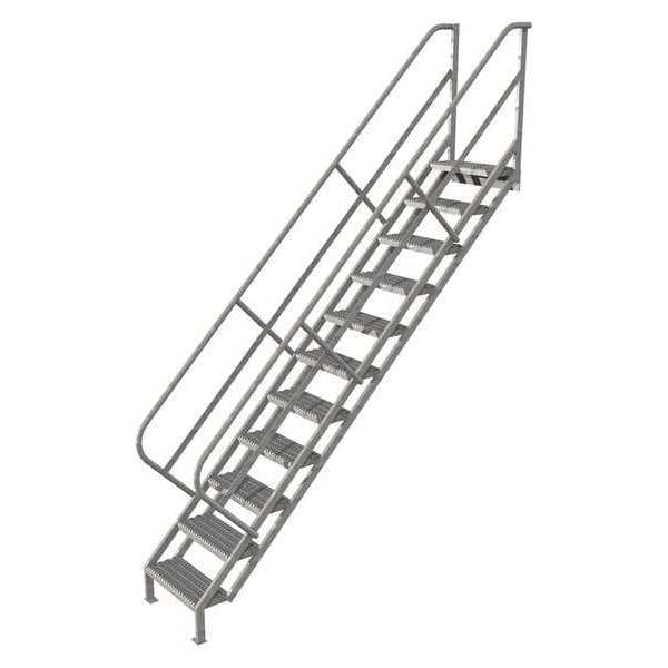 Stair Unit, Material Steel, Number of Steps 11, Handrails Included Yes, Load Capacity 450 lb, Climbing Angle 45 Degrees , Step Tread Serrated, Step Width 24 in, Step Depth 10 in, Base Depth 105 1/2 in, Overall Height 11.9 ft, Color Gray, Standards ANSI, OSHA Compliant, Manufacturers Warranty Length 1 yr, Overall Width 29 in