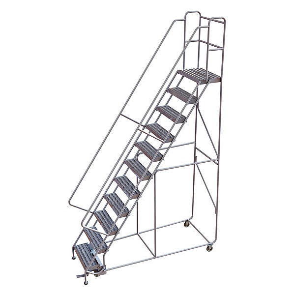 Rolling Ladder, Material Aluminum, Platform Height 9.2 ft, Handrails Included Yes, Handrail Height 2.7 ft, Overall Height 11.8 ft, Number of Steps 11, Assembled, Load Capacity 350 lb, Step Tread Ribbed, Platform Depth 14 in, Platform Width 24 in, Bottom Width 38 in, Base Depth 86 in, Overall Width 38 in, Climbing Angle 56 Degrees , Step Depth 7 in, Step Width 24 in, Ladder Actuation Foot Activated Step Lock, Finish Unfinished, Color Silver, Standards ANSI, OSHA Compliant