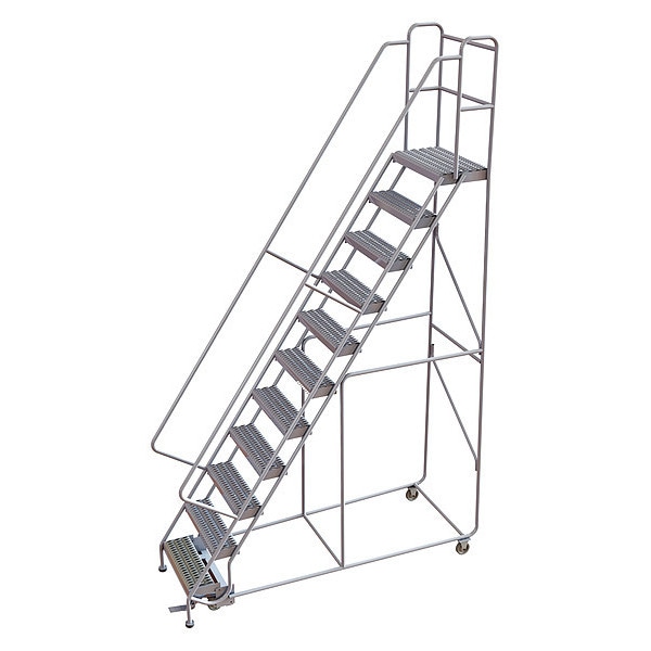 Rolling Ladder, Material Aluminum, Platform Height 9.2 ft, Handrails Included Yes, Handrail Height 2.7 ft, Overall Height 11.8 ft, Number of Steps 11, Assembled, Load Capacity 350 lb, Step Tread Serrated, Platform Depth 14 in, Platform Width 24 in, Bottom Width 38 in, Base Depth 86 in, Overall Width 38 in, Climbing Angle 56 Degrees , Step Depth 7 in, Step Width 24 in, Ladder Actuation Foot Activated Step Lock, Finish Unfinished, Color Silver, Standards ANSI, OSHA Compliant