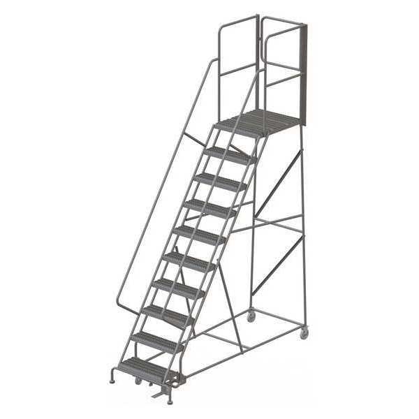 Rolling Ladder, Material Steel, Platform Height 8.3 ft, Handrails Included Yes, Handrail Height 3.5 ft, Overall Height 11.8 ft, Number of Steps 10, Unassembled, Load Capacity 450 lb, Step Tread Serrated, Platform Depth 10 in, Platform Width 24 in, Bottom Width 35 in, Base Depth 96 in, Overall Width 35 in, Climbing Angle 56 Degrees , Step Depth 7 in, Step Width 24 in, Ladder Actuation Foot Activated Step Lock, Finish Powder Coated, Color Gray, Standards ANSI, OSHA Compliant