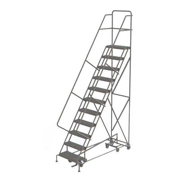 All Direction Ladder, Material Steel, Platform Height 9.2 ft, Handrails Included Yes, Handrail Height 3 ft, Overall Height 21.2 ft, Number of Steps 11, Unassembled, Load Capacity 450 lb, Step Tread Serrated, Platform Depth 17 in, Platform Width 24 in, Bottom Width 35 in, Base Depth 107 in, Overall Width 35 in, Climbing Angle 50 Degrees , Step Depth 8.5 in, Step Width 24 in, Ladder Actuation Foot Activated Step Lock, Finish Powder Coated, Color Gray, Standards ANSI, OSHA Compliant