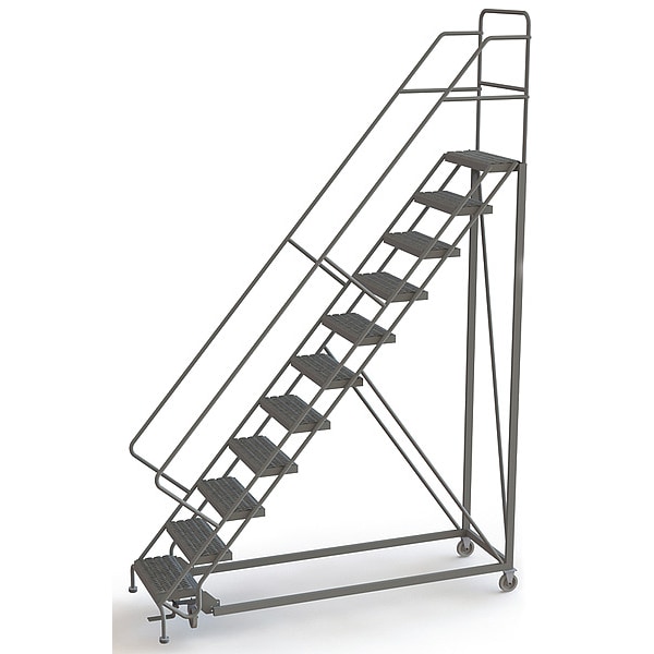 Configurable Rolling Ladder, Material Steel, Platform Height 9.2 ft, Handrails Included Yes, Handrail Height 3 ft, Overall Height 12.7 ft, Number of Steps 11, Unassembled, Load Capacity 450 lb, Step Tread Serrated, Platform Depth 17 in, Platform Width 24 in, Bottom Width 35 in, Base Depth 107 in, Overall Width 35 in, Climbing Angle 50 Degrees , Step Depth 8.5 in, Step Width 24 in, Ladder Actuation Foot Activated Step Lock, Finish Powder Coated, Color Gray, Standards ANSI, OSHA Compliant