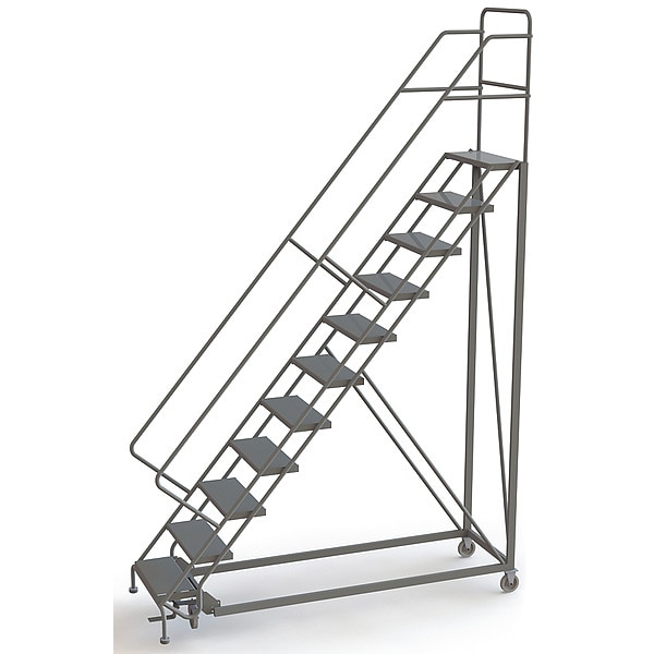 Configurable Rolling Ladder, Material Steel, Platform Height 9.2 ft, Handrails Included Yes, Handrail Height 3 ft, Overall Height 12.7 ft, Number of Steps 11, Unassembled, Load Capacity 450 lb, Step Tread Perforated, Platform Depth 17 in, Platform Width 24 in, Bottom Width 35 in, Base Depth 107 in, Overall Width 35 in, Climbing Angle 50 Degrees , Step Depth 8.5 in, Step Width 24 in, Ladder Actuation Foot Activated Step Lock, Finish Powder Coated, Color Gray, Standards ANSI, OSHA Compliant