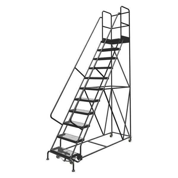 Rolling Ladder, Material Steel, Platform Height 9.2 ft, Handrails Included Yes, Handrail Height 3 ft, Overall Height 12.7 ft, Number of Steps 11, Unassembled, Load Capacity 450 lb, Step Tread Serrated, Platform Depth 30 in, Platform Width 24 in, Bottom Width 35 in, Base Depth 103 in, Overall Width 35 in, Climbing Angle 56 Degrees , Step Depth 7 in, Step Width 24 in, Ladder Actuation Foot Activated Step Lock, Finish Powder Coated, Color Gray, Standards ANSI, OSHA Compliant