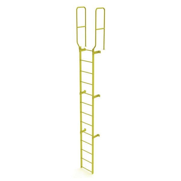 Fixed Ladder, Walk-Thru Included Yes, Exit Top, Overall Height 16 ft, Overall Width 28 in, Material Steel, Load Capacity 450 lb, Number of Steps 13, Top Step Height 12 ft, Rung Dia. 3/4 in, Rung/Step Spacing 12 in, Step Width 18 in, Finish Safety Yellow, Standards ANSI; OSHA Compliant, Includes 42 In. guardrails, Manufacturers Warranty Length 1 yr