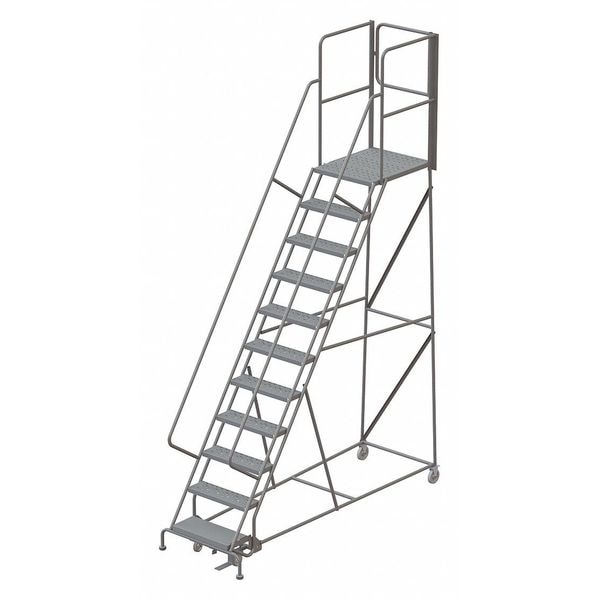 Rolling Ladder, Material Steel, Platform Height 9.2 ft, Handrails Included Yes, Handrail Height 3.5 ft, Overall Height 12.7 ft, Number of Steps 11, Unassembled, Load Capacity 450 lb, Step Tread Perforated, Platform Depth 10 in, Platform Width 24 in, Bottom Width 35 in, Base Depth 103 in, Overall Width 35 in, Climbing Angle 56 Degrees , Step Depth 7 in, Step Width 24 in, Ladder Actuation Foot Activated Step Lock, Finish Powder Coated, Color Gray, Standards ANSI, OSHA Compliant