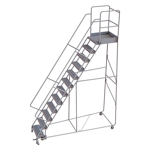 Rolling Ladder, Material Aluminum, Platform Height 10 ft, Handrails Included Yes, Handrail Height 3 ft, Overall Height 13 ft, Number of Steps 12, Assembled, Load Capacity 350 lb, Step Tread Serrated, Platform Depth 14 in, Platform Width 24 in, Bottom Width 38 in, Base Depth 92 in, Overall Width 38 in, Climbing Angle 56 Degrees , Step Depth 7 in, Step Width 24 in, Ladder Actuation Foot Activated Step Lock, Finish Unfinished, Color Silver, Standards ANSI, OSHA Compliant